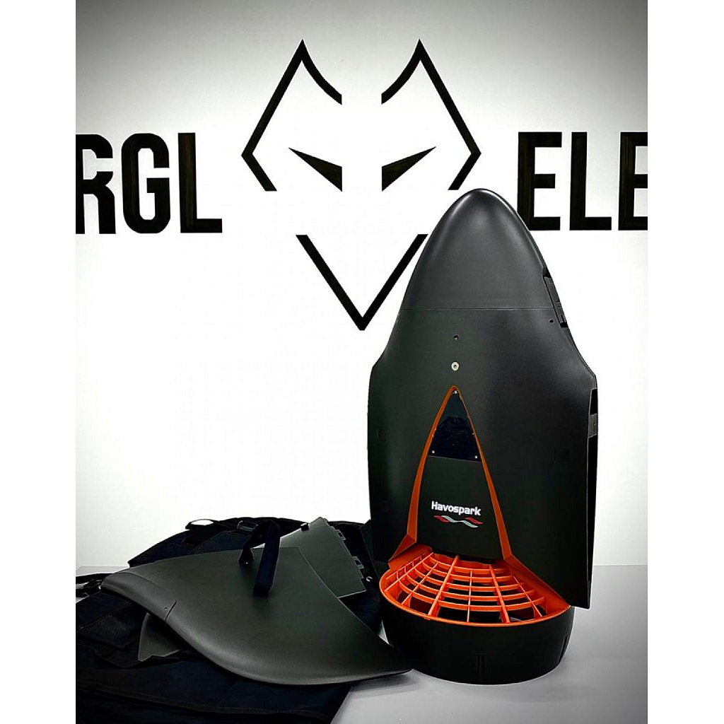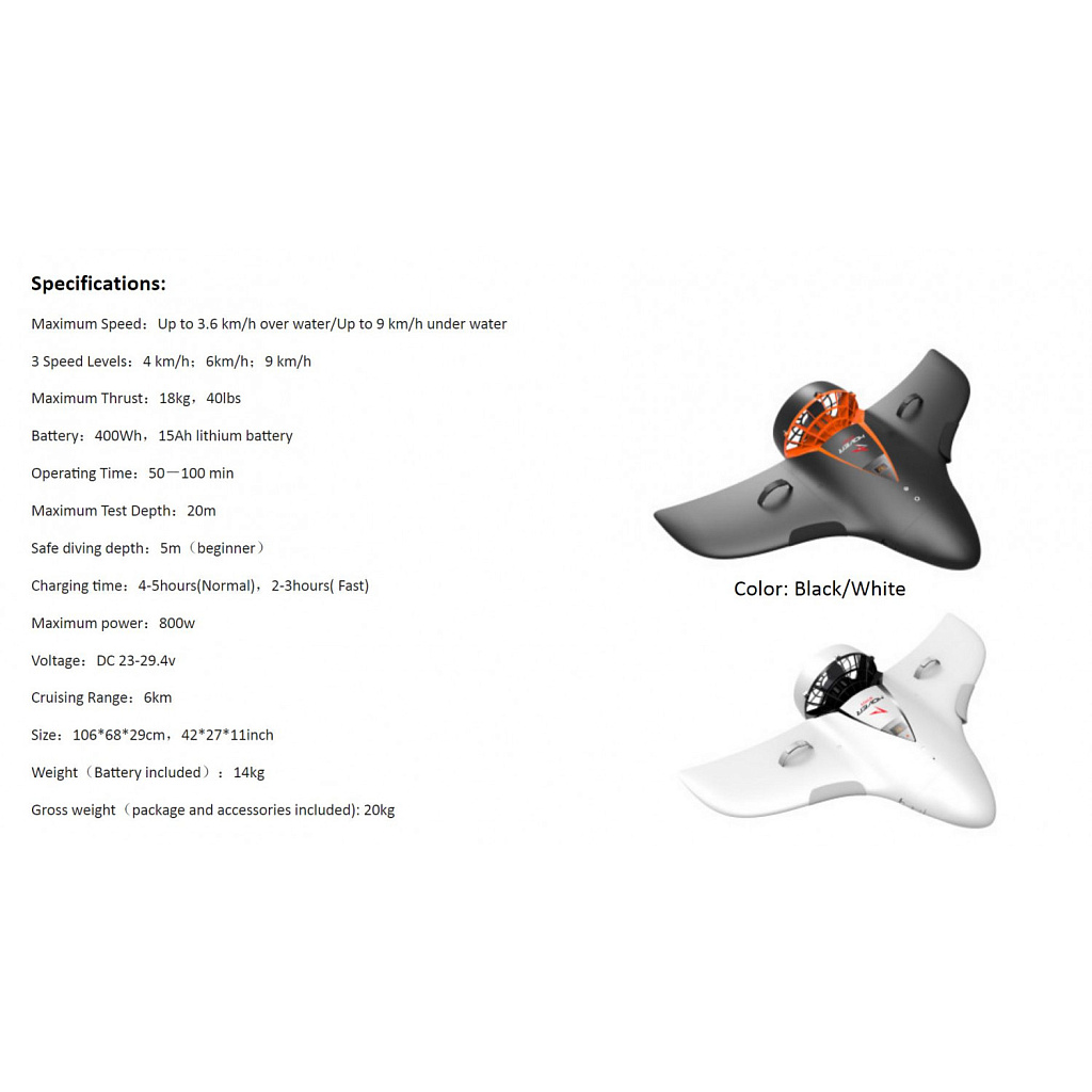 Аквабайк H2 оснащен электродвигателем на 800W, который приводит в движение винт, расположенный в задней части конструкции - он развивает скорость в 4, 6, и 9 км/ч. Максимальная глубина для погружения - 20 метров.