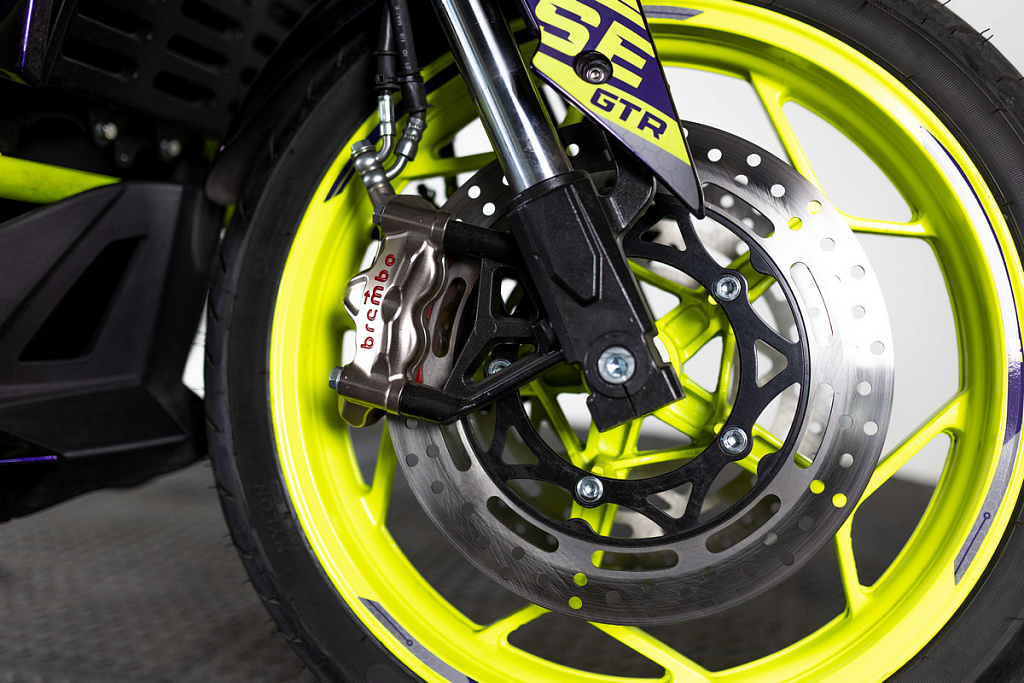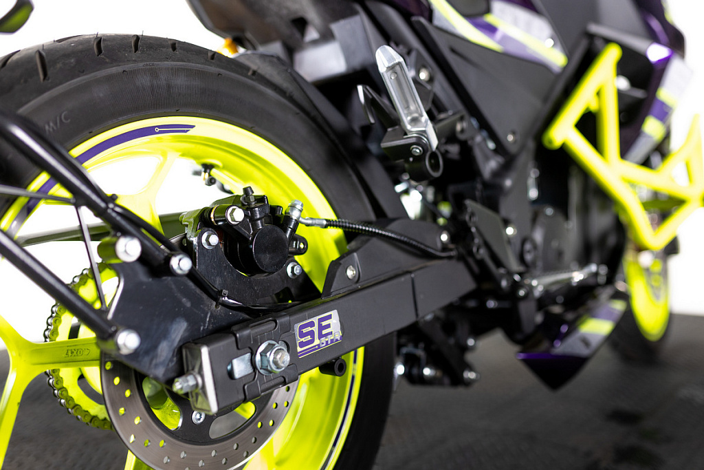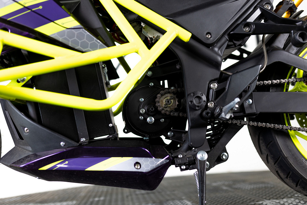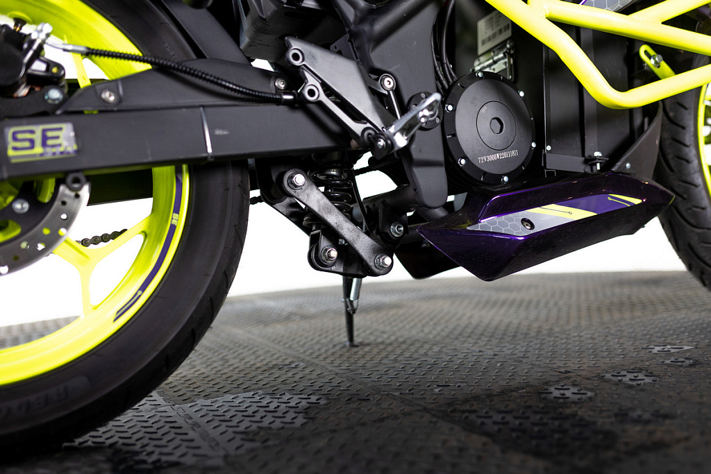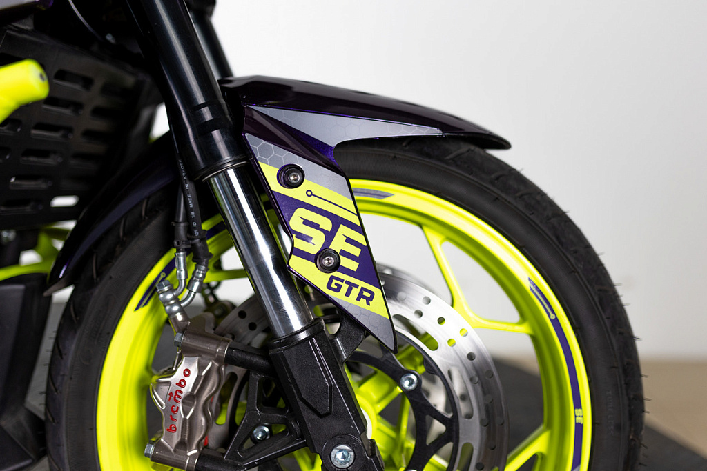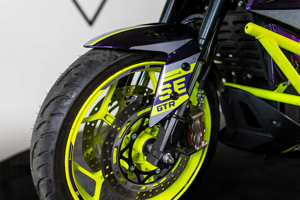 - В отличиe от моделей на моторколёсах, на SE-GTR установлен центральный двигатель, что полностью исключает неподрессоренную массу, делает электромотоцикл более комфортным на высоких скоростях, устойчивым в поворотах и при прохождении неровностей на дороге.