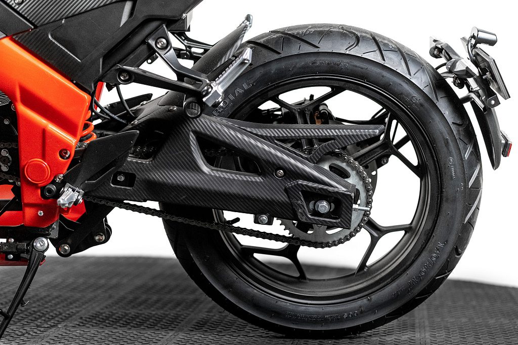 - В отличиe от моделей на моторколёсах, на SE-Panigale установлен центральный двигатель, что полностью исключает неподрессоренную массу, делает электромотоцикл более комфортным на высоких скоростях, устойчивым в поворотах и при прохождении неровностей на дороге.